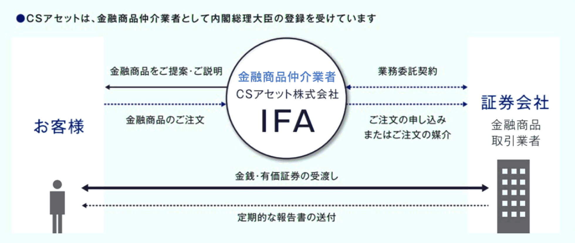 CSアセットは金融商品仲介業(IFA)として特定の証券会社から独立しております。契約する複数の証券会社や保険会社の中から中立的な立場で、お客様のご要望に応じた幅広いご提案・アドバイスを行います。